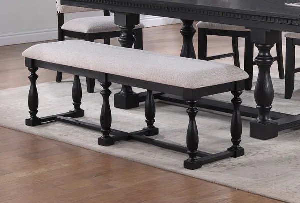 Product Description: This eclectic dining bench will be an excellent update to your dining room. The charcoal finish & beige of the solid wood and veneers give the bench a transitional look that is compounded with the upholstered cream seatback.