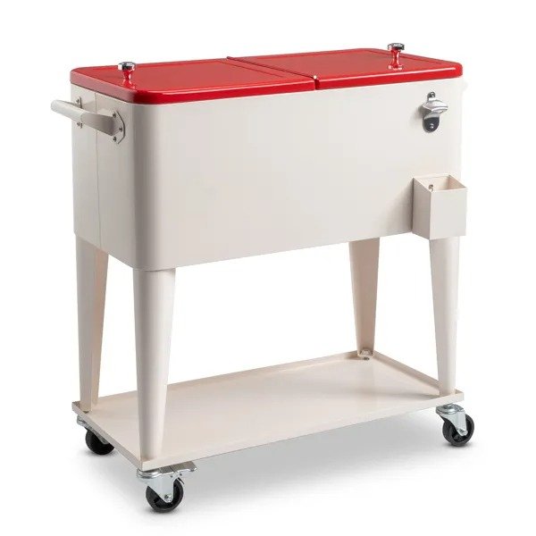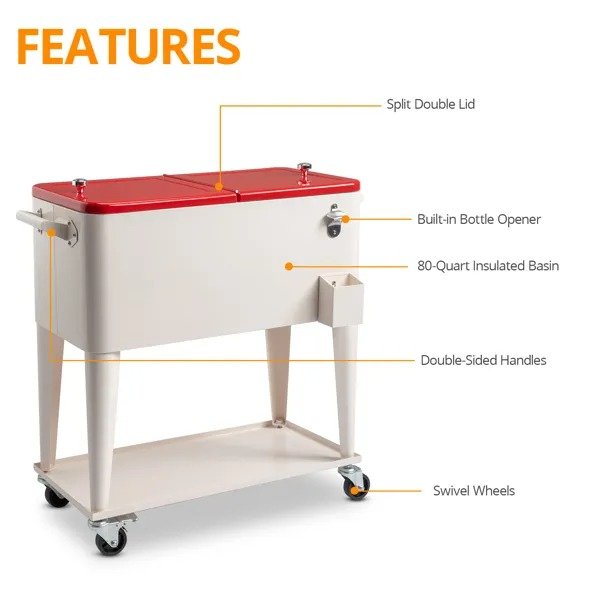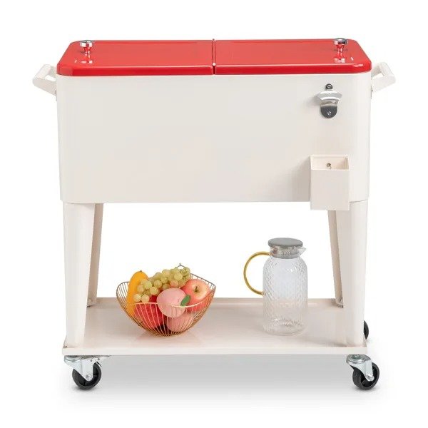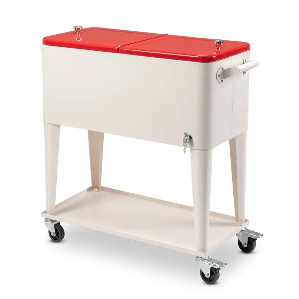 Level up your outdoor events with an all-in-one cooler cart! Fit all the cool refreshments you need with a large, 80-quart fill capacity, and the lower shelf provides extra space for extra beverages or other items you wish to store. Its insulated basin keeps your beverages cold for multiple hours with its injected molded insulation technology. The bottle opener and cap catcher help you easily remove and collect the caps, and the sturdy wheels provide easy mobility when the cooler is full with its locking casters. The drainage cap make it so convenient to clean up the cooler in a nap. Entertain yourself and your guests with this beautiful and high-quality rolling cooler cart!