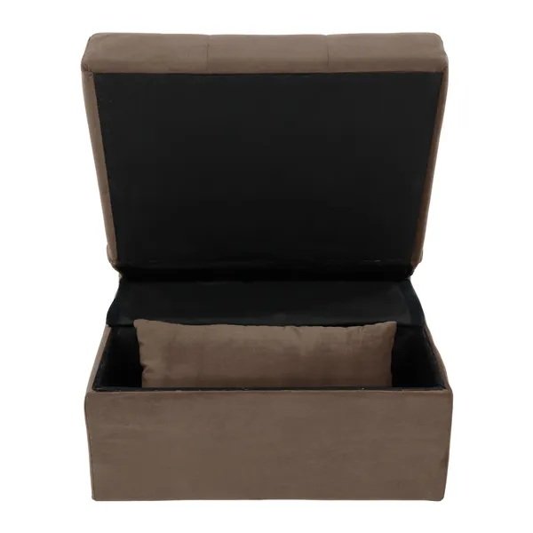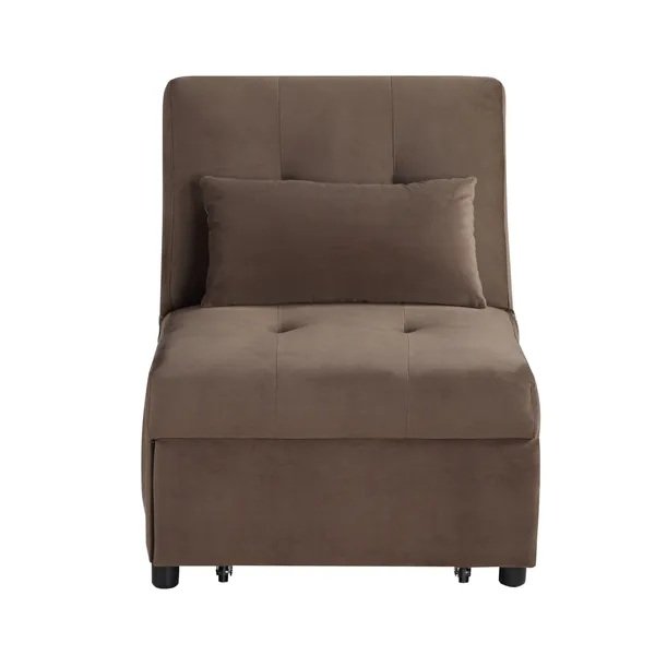 The convenience of the multi-functional Garrell Collection will add modern accent and functionality to meet the need for extra sleep space, storage and seating all in one cleverly designed bench. Half of the bench opens to reveal hidden storage, allowing for the raised portion to turn the bench into a seat. The pop-up unit allows for extension creating a convenient sleep platform that is fully engaged with the seatback returned to a flat position. A coordinating pillow is also included. Allowing for perfect placement within your decorative environment, the bench is offered in dark brown velvet.PRODUCT DIMENSIONS: Overall Dimension: Bench: 45.5" x 27.5" x 17" - 34"H, Bed: 27.5" x 73.5" x 17" - 34"HChair back height: 34"Seat width: 27.5"Seat depth: 24" / 51"Seat height: 17"Pillow dimension: 20" x 11"Listing Includes: One Convertible Bench Only.Simple Assembly Require.