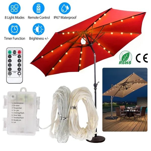 *8 Brightness Modes*:Gorgeous lighting modes including combination; wave; sequential; fading slowly; slow-glow; chasing; twinkle and steady on. Suitable for decorating umbrella or tents with 8 ribs. Ideal for decorating your patio; garden; deck; backyard; pool; gate; yard; party etc; also can be used as decorative string lights for cafe; bar; Christmas tree and other places.(Note:Umbrella not included)