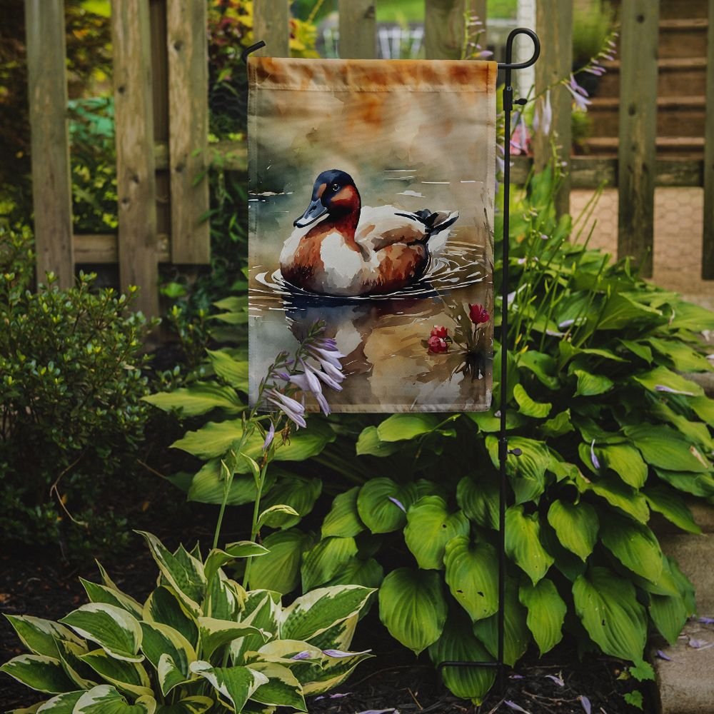 Garden Flag featuring breed specific Canvasback artwork. Enhance the beauty of your garden, patio, or yard with Caroline's Treasures Decorative Garden Flag, proudly made in the USA. Crafted from two pieces of thick, double-sided polyester fabric, this 2-ply garden flag is designed to withstand various weather conditions, making it water-resistant and weatherproof. Featuring correctly readable words on both sides, this garden flag offers a delightful visual experience from any angle. With its heavier weight, it stands out among other garden flags, ensuring stability and durability even in wind, rain, and snow. Measuring approximately 11 1/4 inches by 15 1/2 inches, this flag allows you to personalize your outdoor decor. It comes with a 1 1/2-inch sleeve sewn in, allowing easy attachment to any standard garden flag stand or garden size porch hanger (sold separately). Make a statement in your outdoor space with Caroline's Treasures Decorative Garden Flag, a vibrant and high-quality flag that adds color and personality to your surroundings. Proudly made in the USA, it's a symbol of quality craftsmanship and attention to detail.