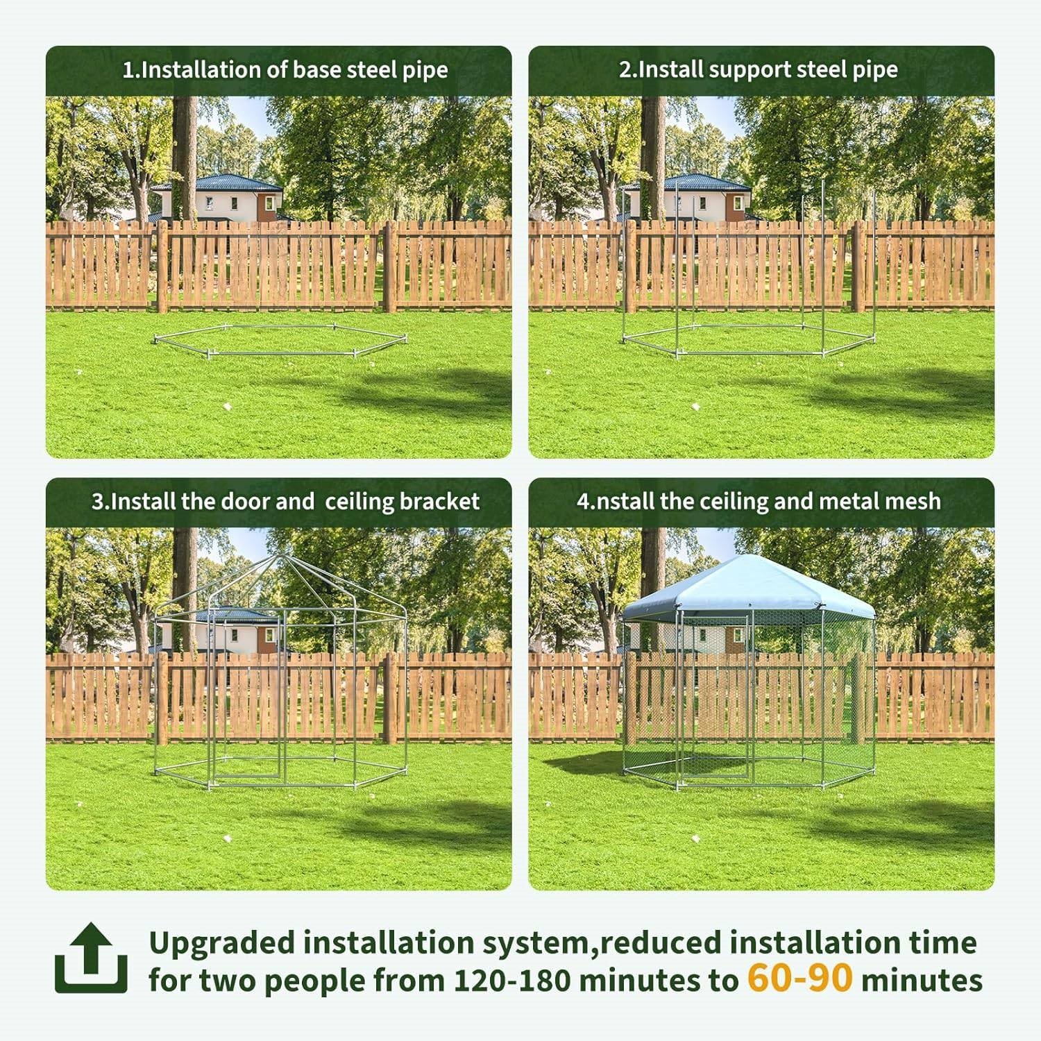 The Hexagonal 9.2 Ft Outdoor Backyard Walk-in Metal Chicken Coop w/ Waterproof Cover has greatly improved the stability and pressure resistance, extending the service life of the chicken coop,This is our structural improvement.All parts are carefully selected, including painted metal connectors, galvanized pipes with a diameter of 25mm and a wall thickness of 0.65mm, fully covered with PVC-coated steel wire mesh, and the top and sides are made of waterproof and UV-resistant removable 360D Oxford cloth.Compared with ordinary dome or pointed chicken coops, we have improved the assembly method and shortened the assembly time. Two adults can assemble it in 60-90 minutes.