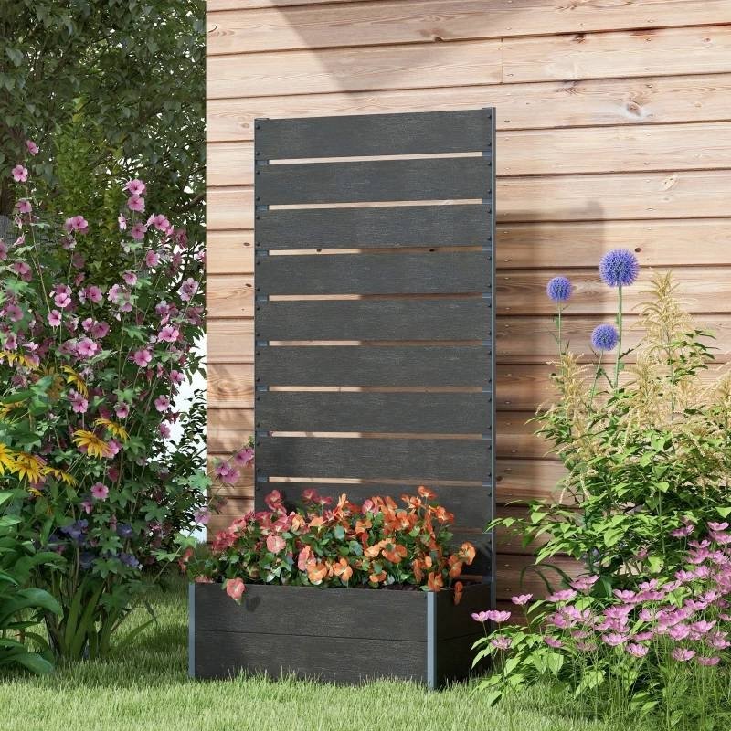 GROW BIG OR GROW HOME! This Wood-Plastic Composite Raised Bed with Slatted Fence Trellis will be the beauty of any home grow. Bring beauty to your backyard with the added elegance of climbing plants. This planter with trellis allows vines to grow or gives you a place to hang lights and outdoor decor. With 27.25" x 13.5" x 8.25" of room, plants can reach their potential. This raised flower bed brings 9 gallons of movable grow space to your backyard. Make a garden anywhere outside; it's excellent for the porch, patio, or balcony. Unlike ordinary wood that's prone to cracking and fading, our raised bed for gardening is made of textured wood-plastic composite giving it a wood-like appearance with an all weather build. A powder coated aluminum frame reinforces it as a whole. A water-draining gap makes our outdoor garden planter breathable, providing oxygen and managing moisture levels for your herbs, vegetables, or climbing plants.