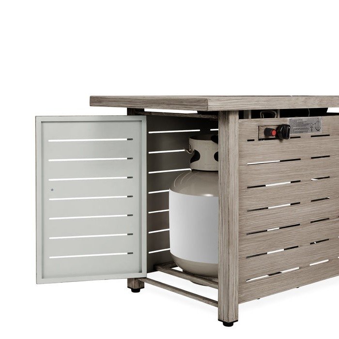Relax and stay warm all winter long with this 50,000 BTU Grey Steel LP Gas Propane Fire Pit w/ Auto Ignition. Change and conceal your gas tank quickly with a convenient tank holder hidden behind a side door that works with a standard 20 lbs. propane tank. Propane tank is not included. Heavy-duty rust- and weather-resistant steel panels with a matching frame protects a powerful heating element and ensures years of outdoor heating. Enjoy an elegant accent to your burner, or cover the burner and have an attractive table to share light meals and drinks with guests. A durable nylon cover ensures this fire pit table will withstand the elements when not in use.
