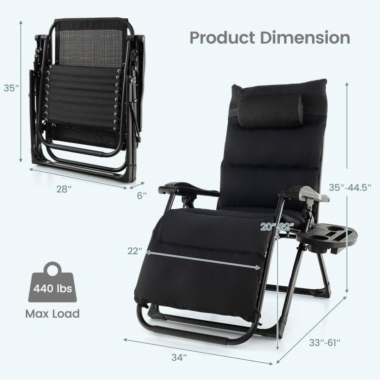 Relax in style with this Zero Gravity Adjustable Lounge Chair Removable Cushion Cup Holder Tray. Easily select the most comfortable angle from 90°-170°, just pull the ring to adjust and lock, greatly meeting your different needs, such as reading, relaxing and sunbathing, etc. 4 inch thickness makes this cushion ultra-soft, providing ultimate comfort. Simply untie the fixing ropes to remove the cushion. Supported by heavy-duty metal frame with non-slip l-shaped foot pads, this zero gravity chair comes with 440 lbs. max load. The thickened pillow is adjustable so that you can use it to support your head or lumbar for customized coziness.