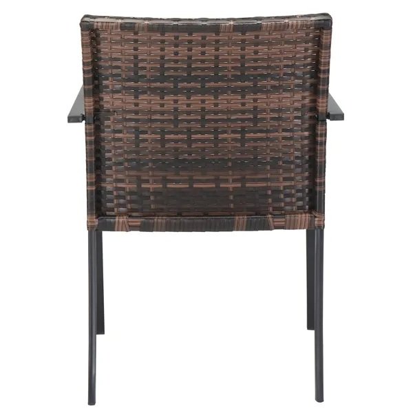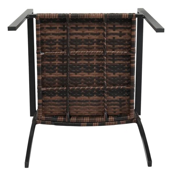 Whether you're hosting a gathering or enjoying a quiet moment outdoors, the Stackable Wicker Dining Chairs are the perfect addition to your outdoor space. These chairs are designed to withstand the elements and provide comfort and style to your patio, deck, garden, or yard. The chairs feature a durable steel frame with a powder-coated finish, ensuring long-lasting use. The all-weather wicker wrapping adds a touch of elegance and resists fading or peeling. With a stackable design, these chairs are easy to store when not in use. The inward sloping backrest and comfortable armrests provide optimal support and relaxation.